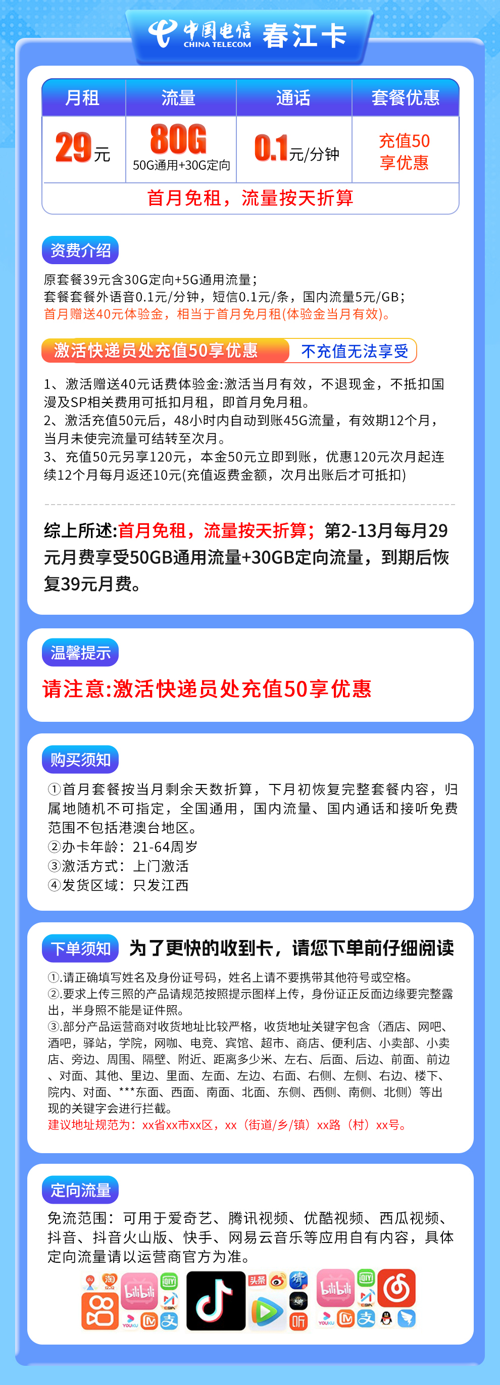电信春江卡29元套餐(限江西):