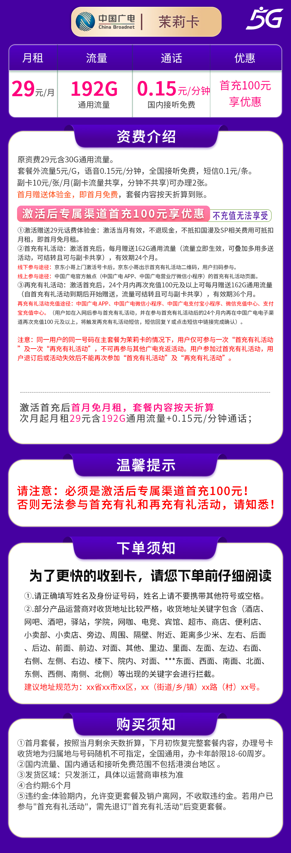 广电茉莉卡29元套餐:192GB流量,仅限浙江地区办理。