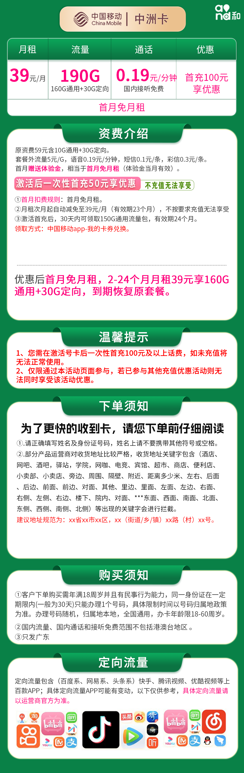 广东移动39元套餐:首月免费,次月起39元月租享190G流量(含30G定向),需首充100元激活优惠,有效期两年。