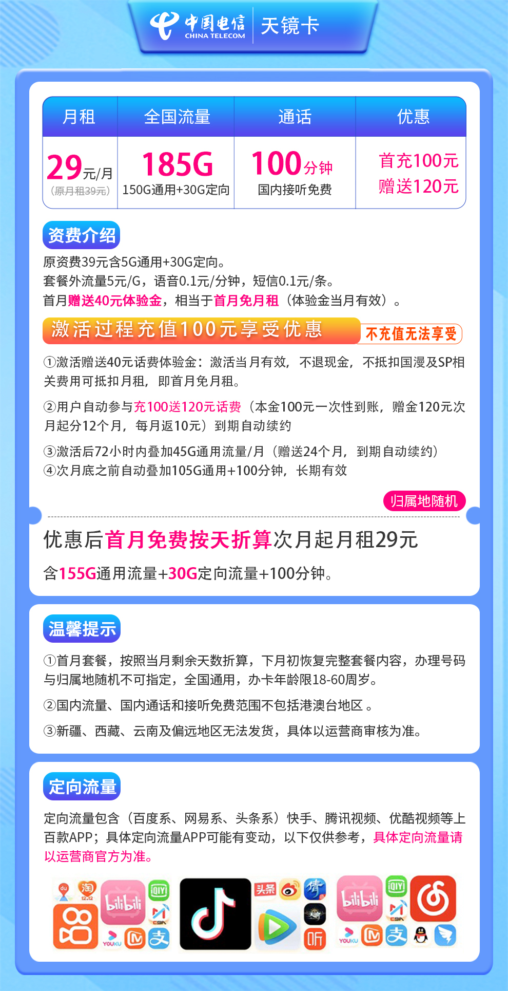 次月开始29元/月155G通用流量+30G定向流量+100分钟