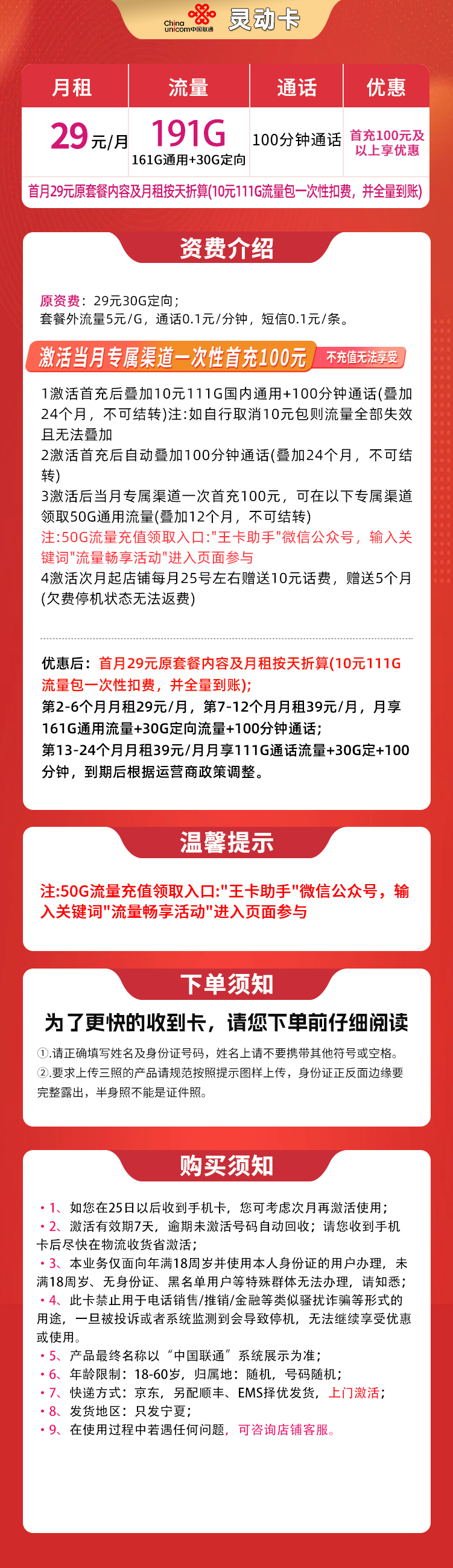 联通灵动卡29元191G+100分钟【只发宁夏】