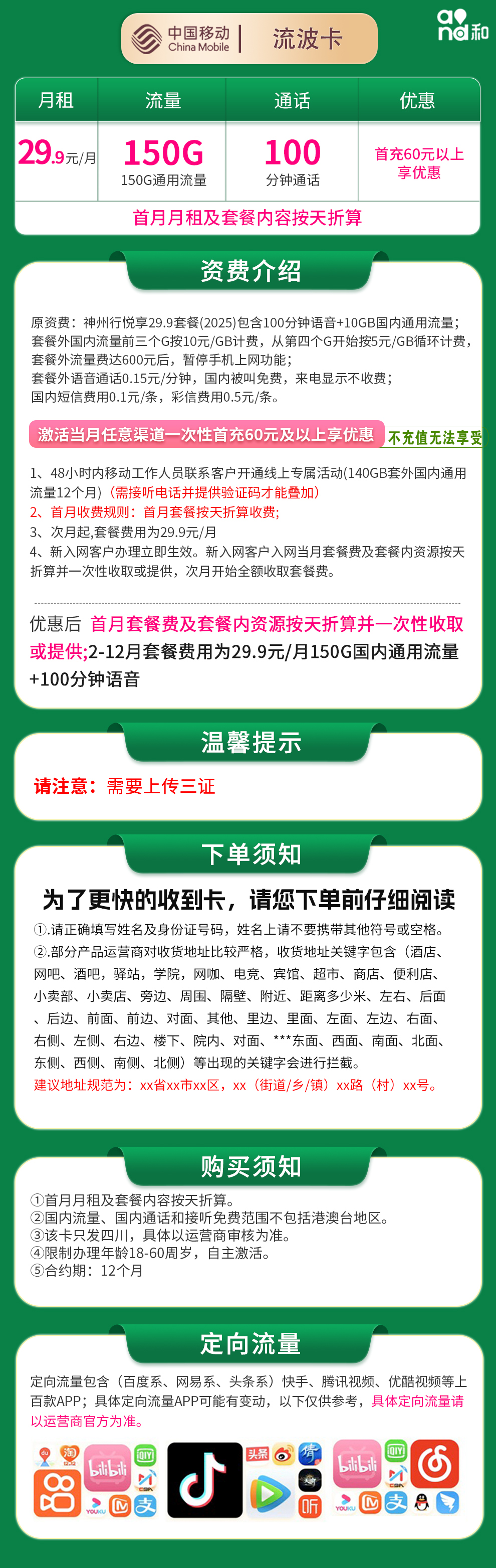移动流波卡29.9元套餐(仅限四川):