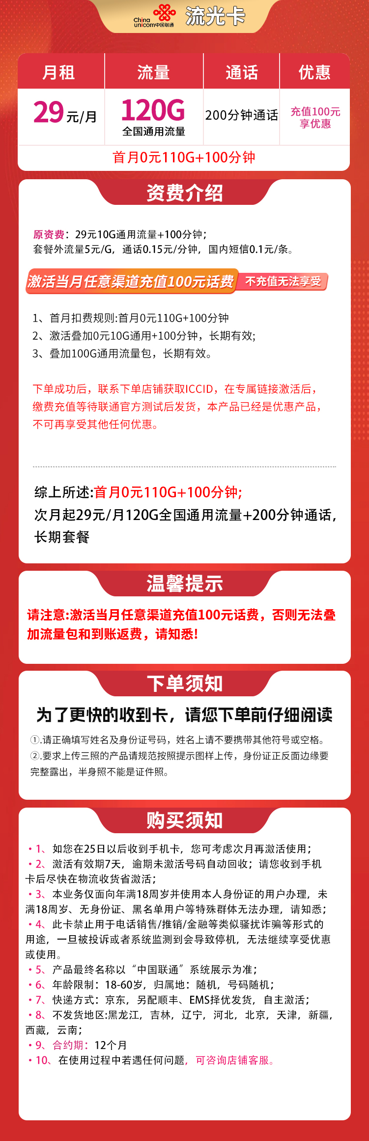 激活当月任意渠道充值100元话费享优惠(不充值无法享受)1、首月扣费规则:首月0元110G+100分钟2、激活叠加0元10G通用+100分钟,长期有效3、叠加100G通用流量包,长期有效下单成功后,联系下单店铺获取ICCID,在专属链接激活后,缴费充值等待联通官方测试后发货,本产品已经是优惠产品,不可再享受其他任何优惠。综上所述: