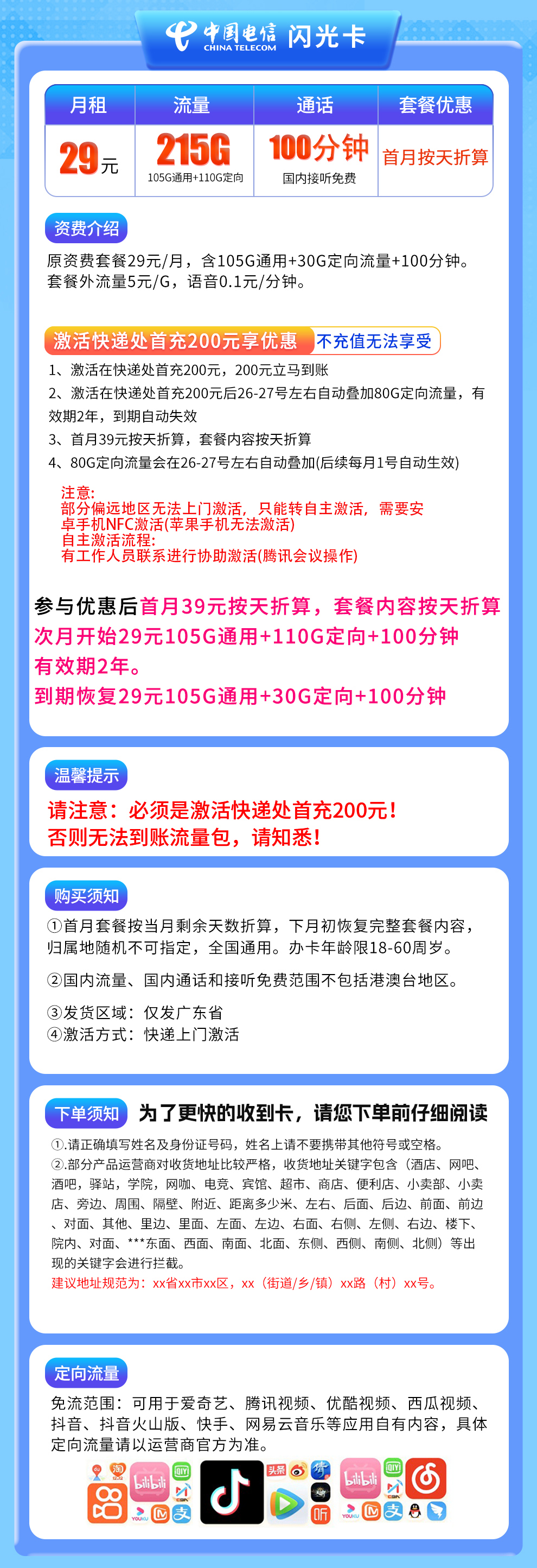【电信闪光卡】29元月租,包含215G全国通用流量+100分钟通话,仅限广东地区办理。