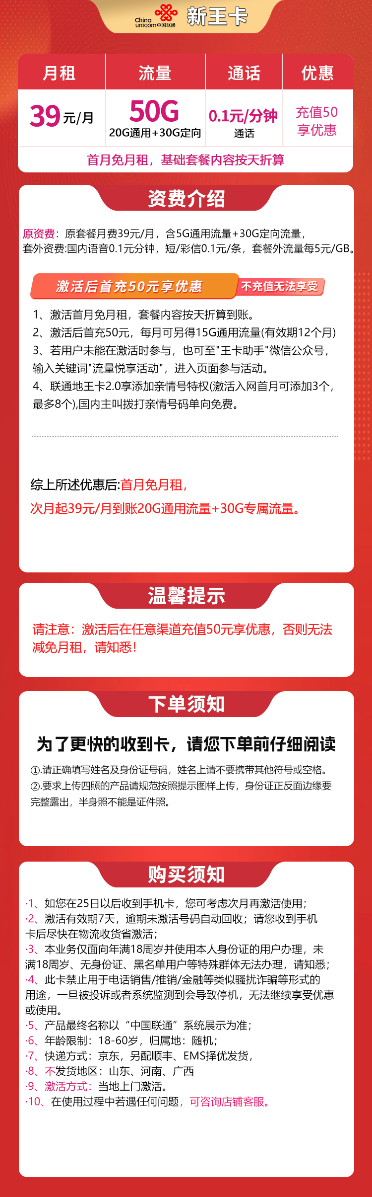 2、激活后首充50元,每月可另得15G通用流量(有效期12个月)