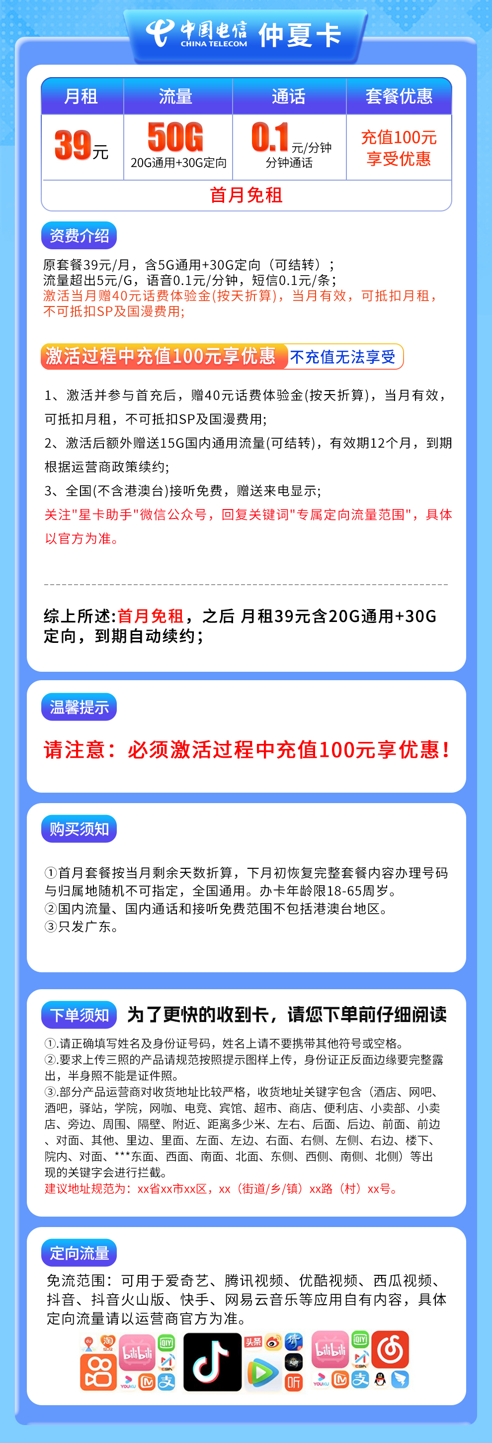 - **首月免月租**,激活需充100元享优惠。