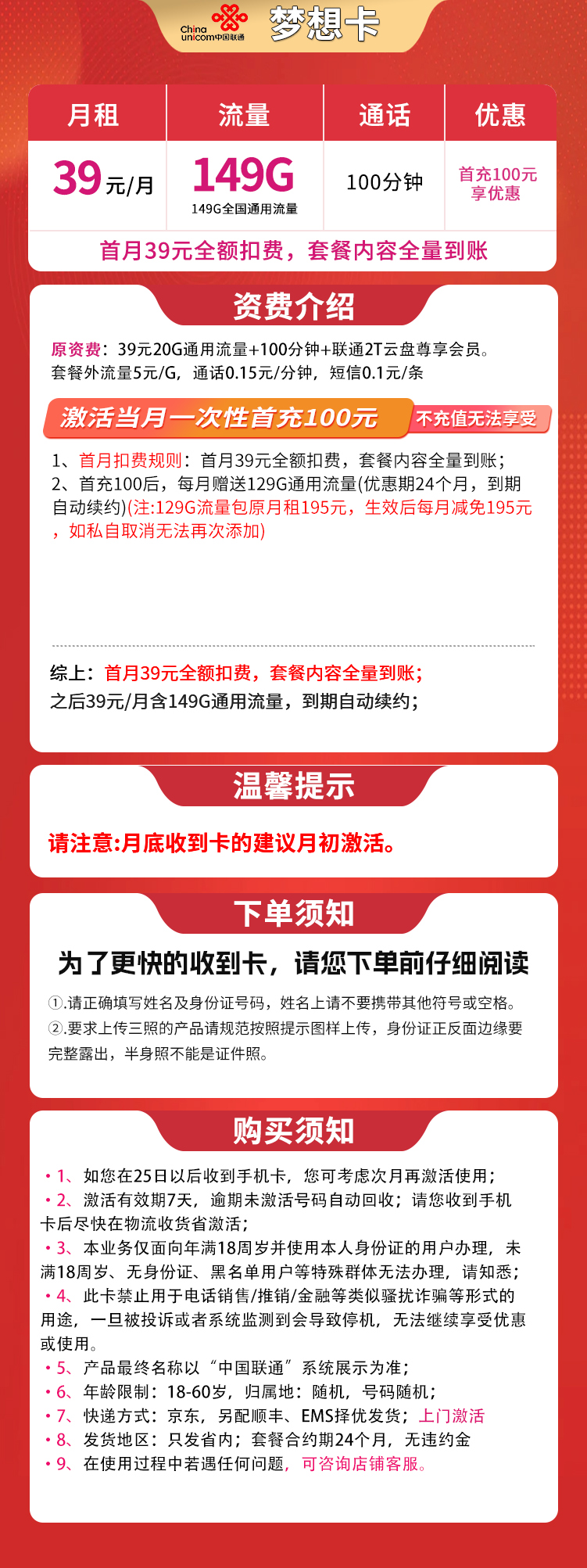 **总结**:首月39元,之后长期39元/月,享149G省内通用流量+100分钟通话,需首充100元激活优惠。