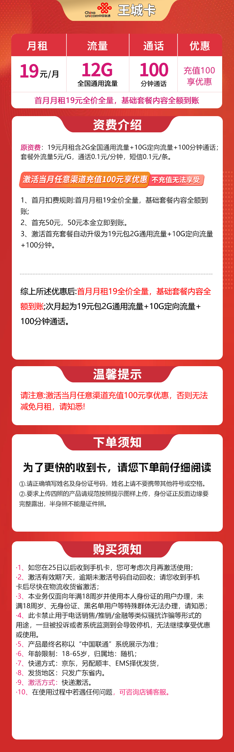 原资费:19元月租含2G全国通用流量+10G定向流量+100分钟通话