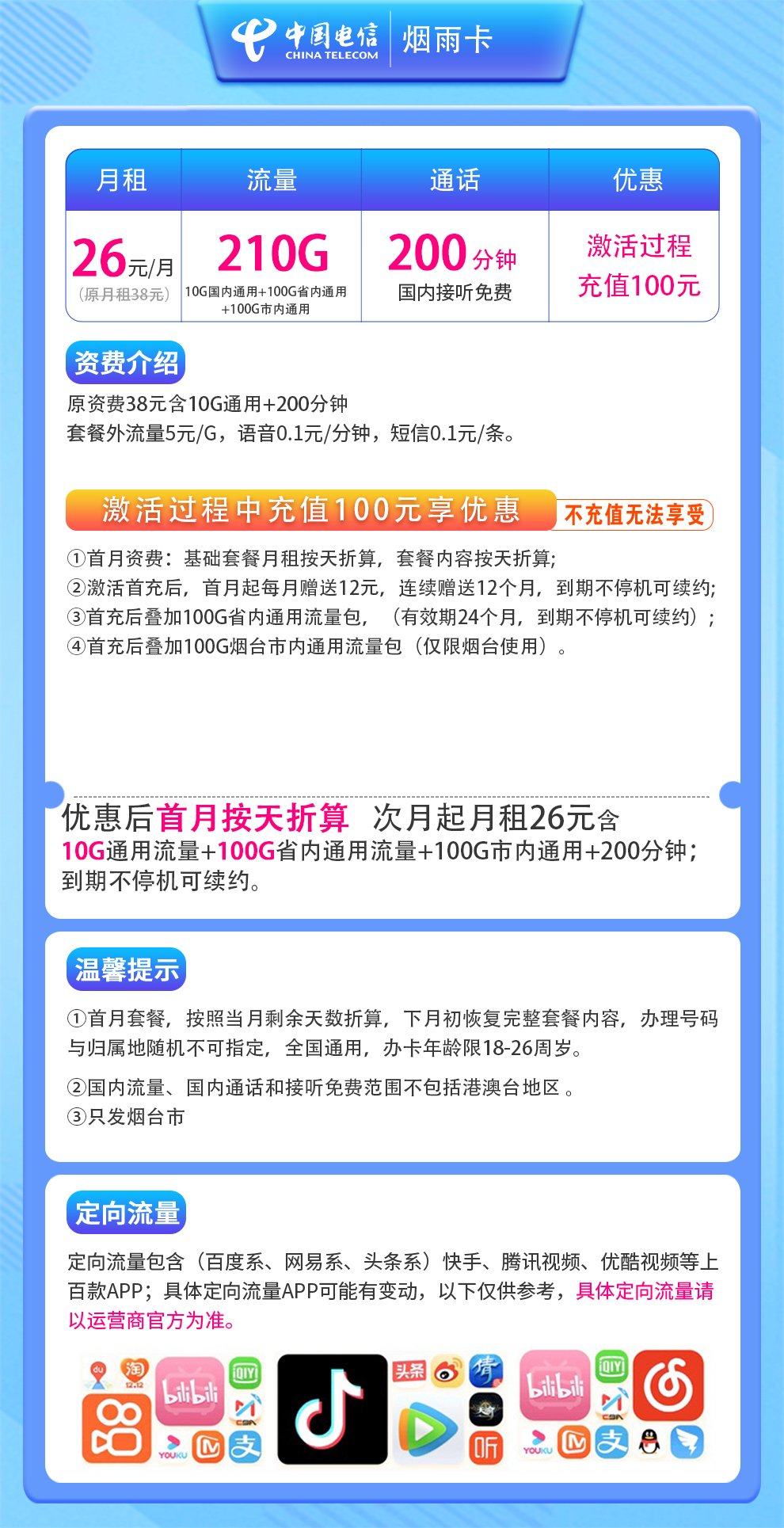 电信烟雨卡:26元月租,包含210G通用流量和200分钟通话,仅限烟台地区办理。
