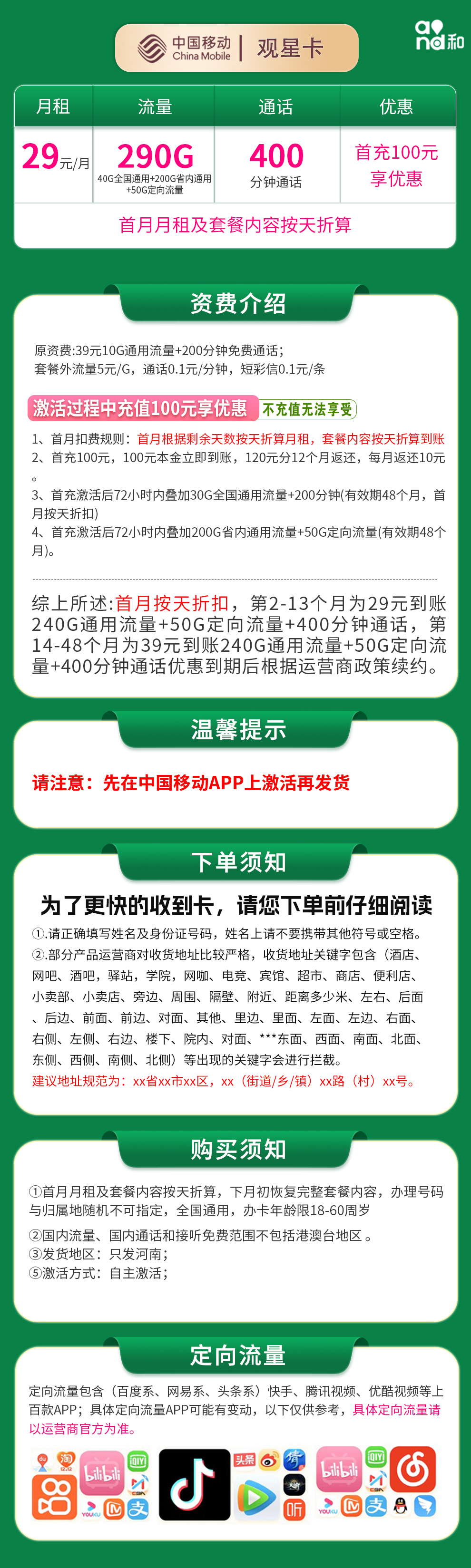 29元月租,包含290G流量和400分钟通话,仅限河南地区办理。