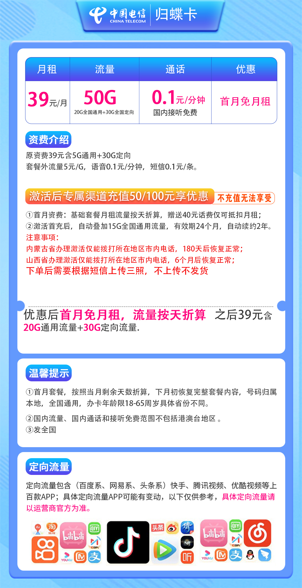 电信归蝶卡,月租39元,包含50G流量(20G通用+30G定向),全国可用。