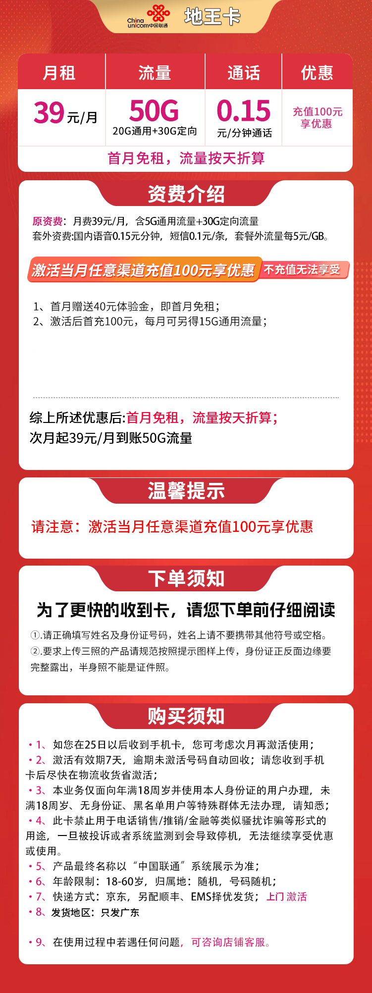 广东联通地王卡:首月免费用,次月起每月39元得50G流量。激活后需充值100元才能享受优惠。