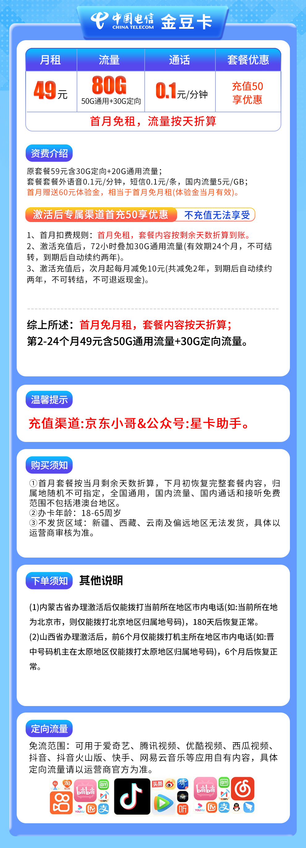 电信金豆卡49元套餐:每月80G全国通用流量,性价比高,适合流量需求大的用户。