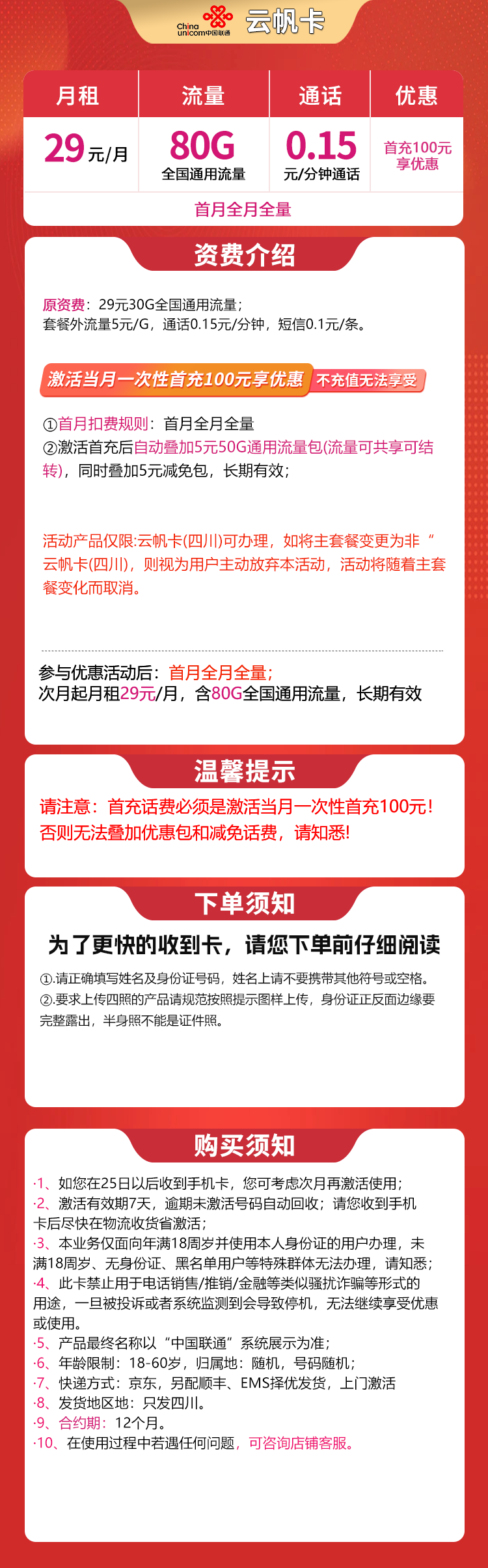 四川联通29元套餐:首充100元后,每月29元享80G全国通用流量,长期有效。注意:仅限云帆卡(四川)办理,变更套餐将失效。