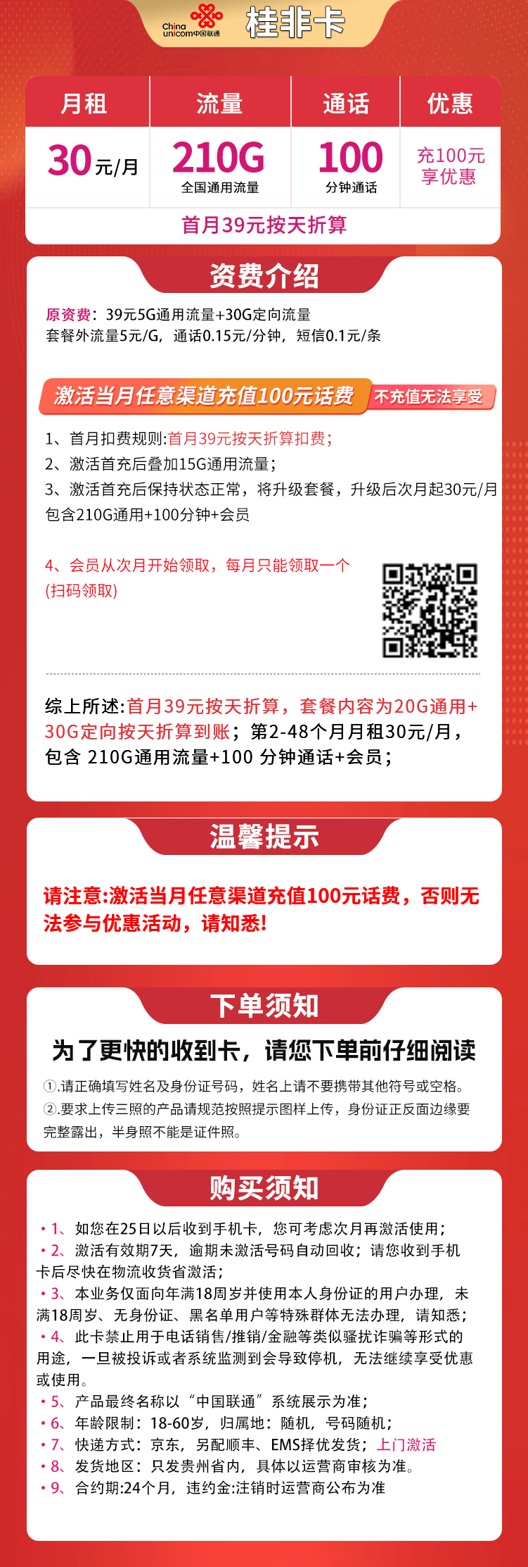 贵州联通30元套餐:210G流量 + 100分钟通话。
