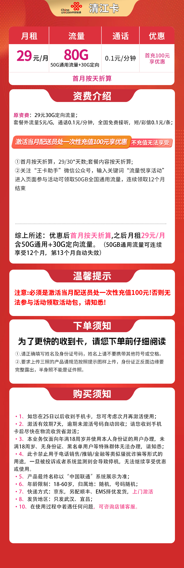 联通清江卡29元套餐(限武汉宜昌):