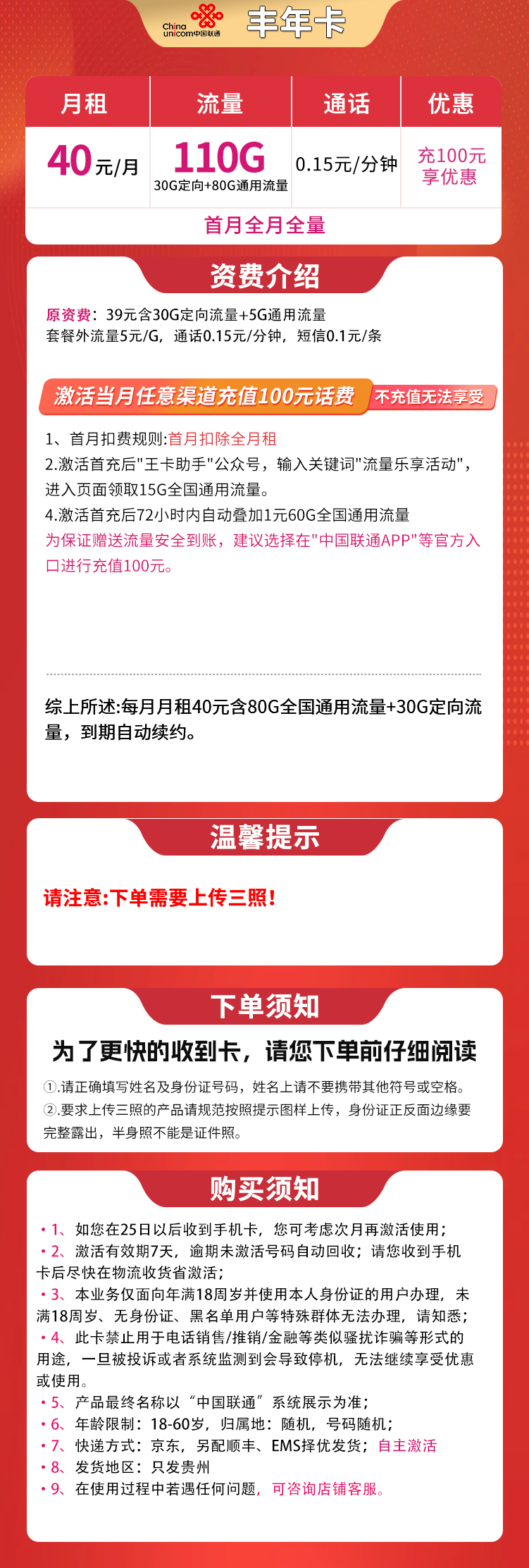 为保证赠送流量安全到账,建议选择在"中国联通APP"等官方入口进行充值100元。综上所述:每月月租40元含80G全国通用流量+30G定向流量,到期自动续约