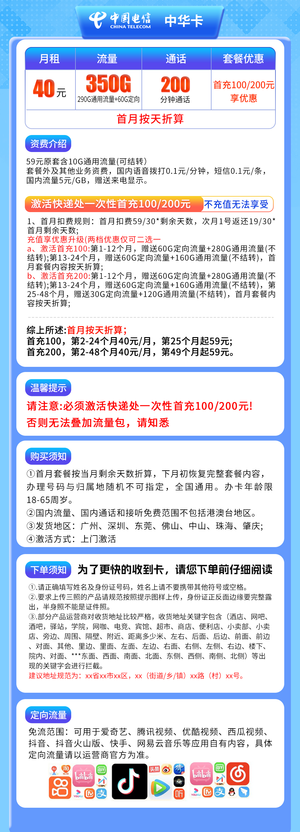 - 需在激活时一次性充值100元或200元才能享受优惠(不充值则无优惠)。