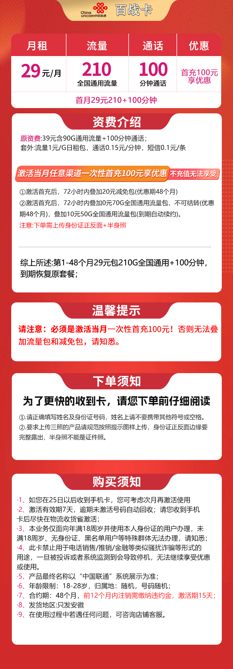 第1-48个月29元包210G全国通用+100分钟,到期恢复原套餐;