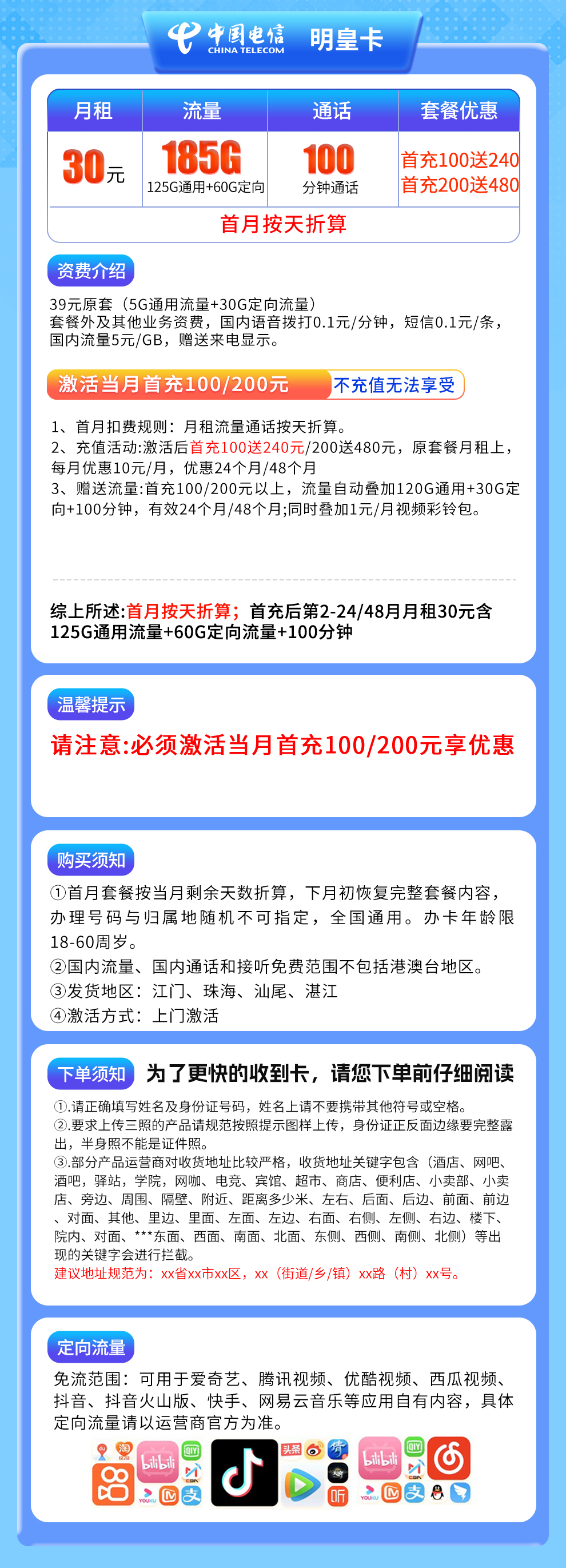 电信明皇卡30元185G+100分钟【只发广东11市】