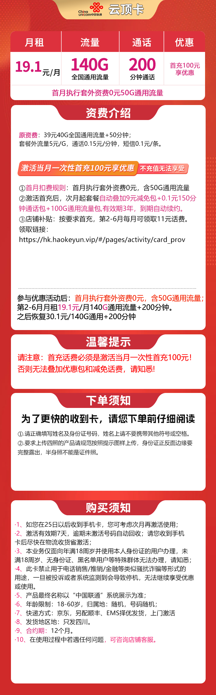【联通云顶卡】四川专属,19.1元/月享140G流量+200分钟通话,优惠期3年。