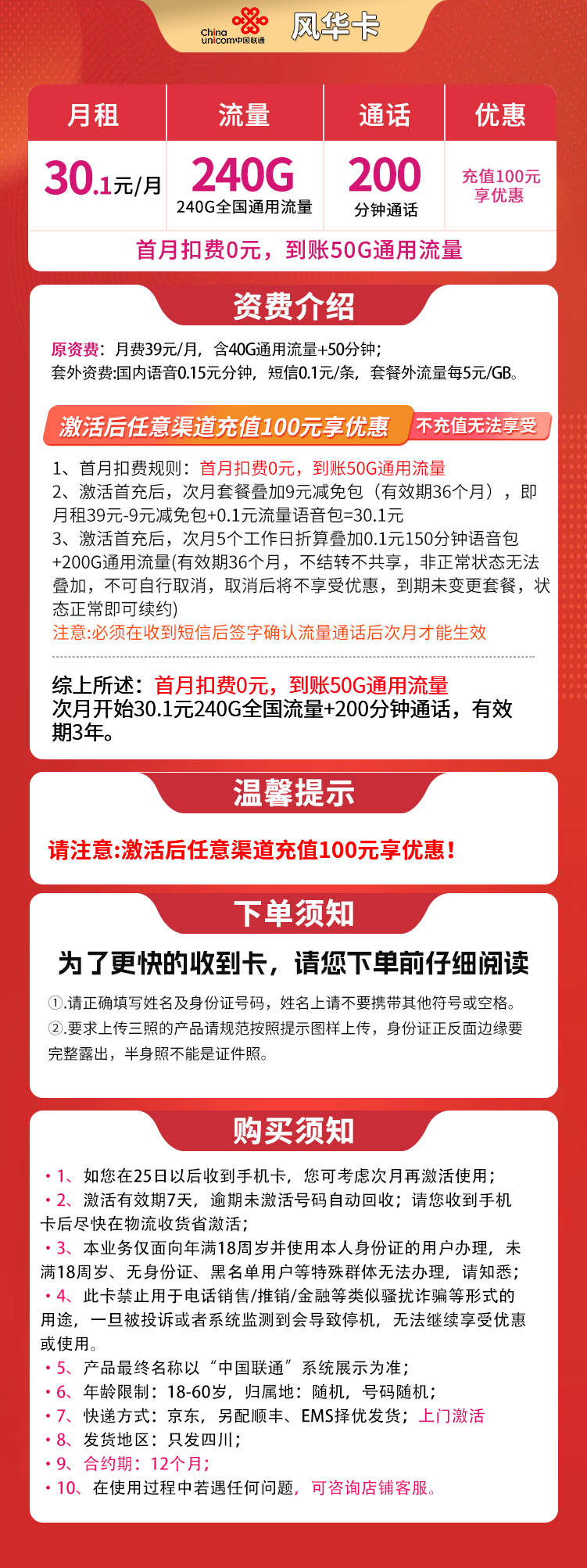 次月开始30.1元240G全国流量+200分钟通话,有效期3年。