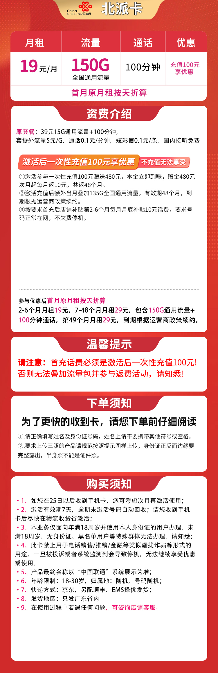 激活后一次性充值100元,方可享受以下优惠: