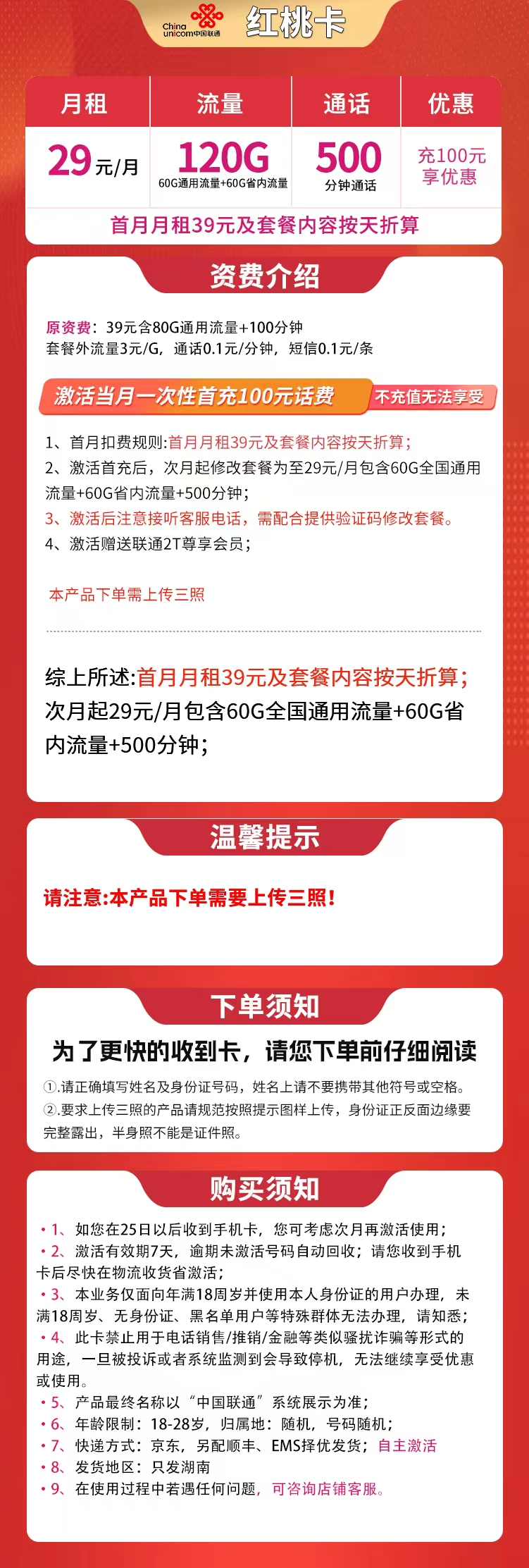【联通红桃卡】29元月租,包含120G通用流量和500分钟通话,仅限湖南地区办理。