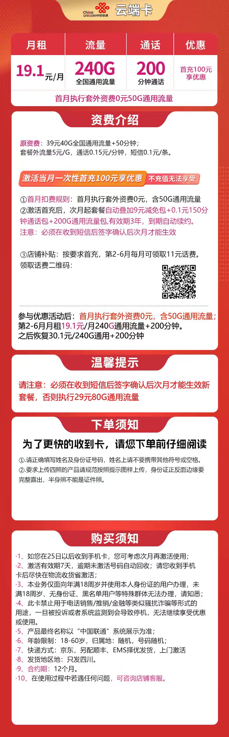 激活当月一次性首充100元享优惠(不充值无法享受)1,首月扣费规则:首月执行套外资费0元,含50G通用流量2,激活首充后,次月起套餐自动叠加9元减免包+0.1元150分钟通话包+200G通用流量包,有效期3年,到期自动续约。注意:必须在收到短信后签字确认后次月才能生效店铺补贴:按要求首充,第2-6月每月可领取11元话费综上所述:首月执行套外资费0元,含50G通用流量第2-6月月租19.1元/月240G通用流量+200分钟。之后恢复30.1元/240G通用+200分钟