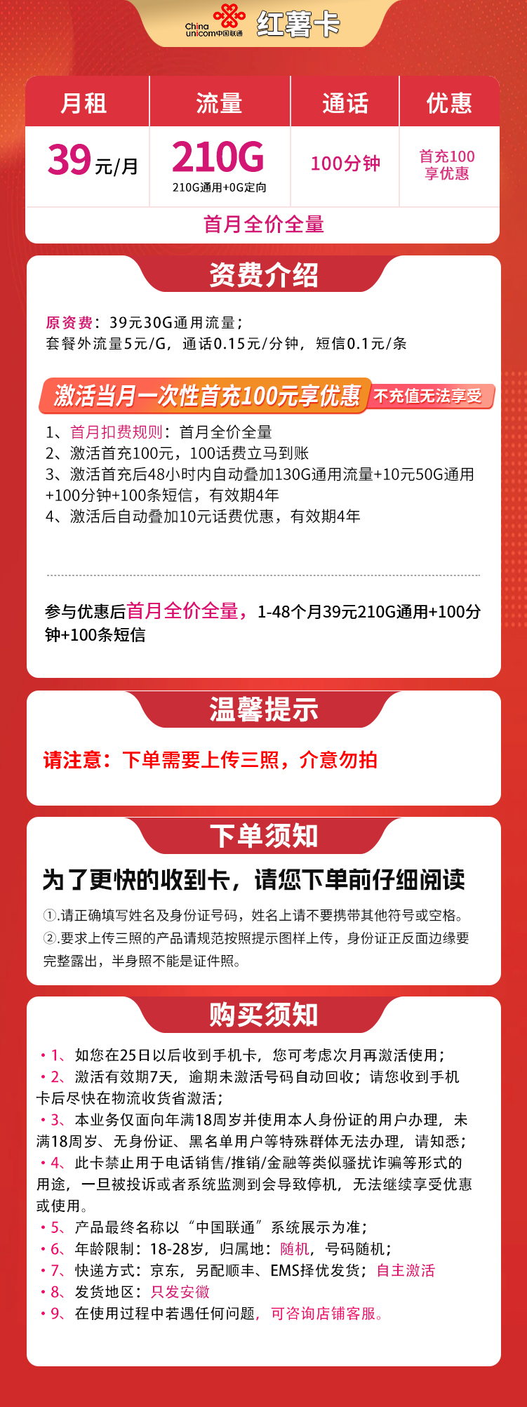 激活当月一次性首充100元享优惠(不充值无法享受)1、首月扣费规则:首月全价全量2、激活首充100元,100话费立马到账3、激活首充后48小时内自动叠加130G通用流量+10元50G通用+100分钟+100条短信,有效期4年4、激活后自动叠加10元话费优惠,有效期4年综上所述:参与优惠后1-48个月39元210G通用+100分钟+100条短信