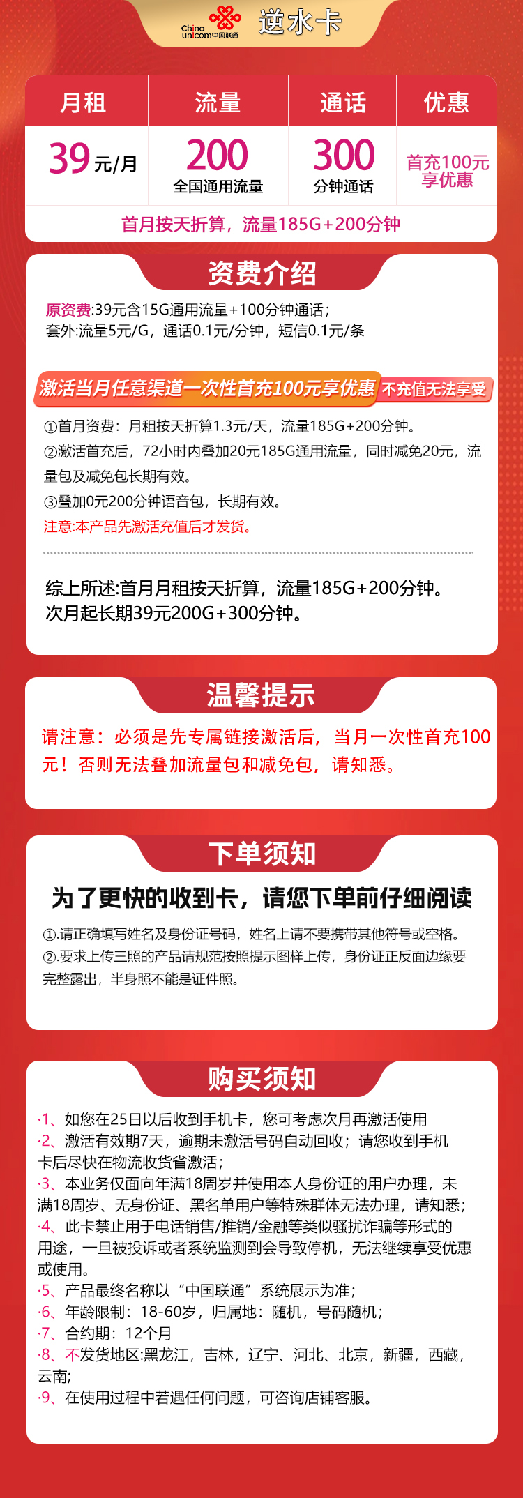 激活当月任意渠道充值100元话费享优惠(不充值无法享受)1、首月扣费规则:首月按天折算,185G全国流量+200分钟2、激活当月叠加185G通用流量+200分钟,长期有效。注意:本产品先激活充值后发货,介意勿拍综上所述:首月按天折算,185G全国流量+200分钟次月起月租39元含200G通用+300分钟,长期有效