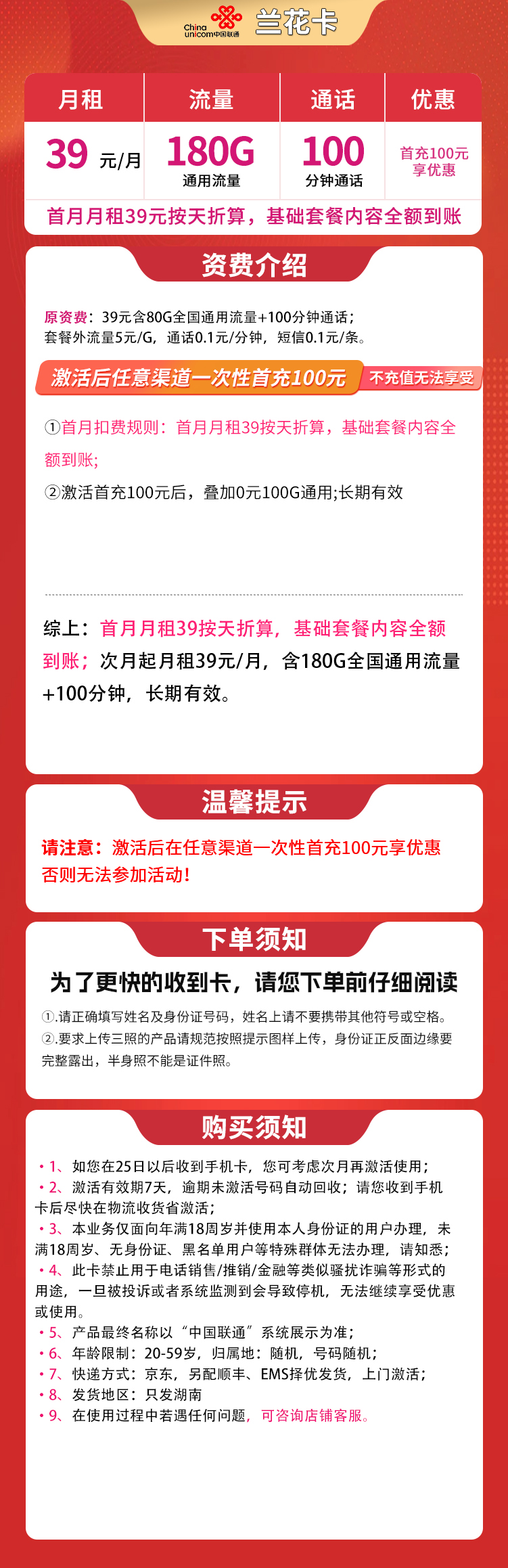湖南联通兰花卡:39元月租,含180G通用流量+100分钟通话,长期有效。激活后需首充100元,首月月租按天折算。