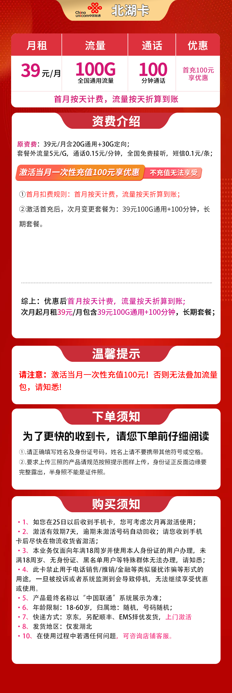 【联通北湖卡】湖北用户专享,39元月租,含100G通用流量+100分钟通话,长期有效。激活首月需充值100元才可享受优惠,首月费用和流量按天折算。