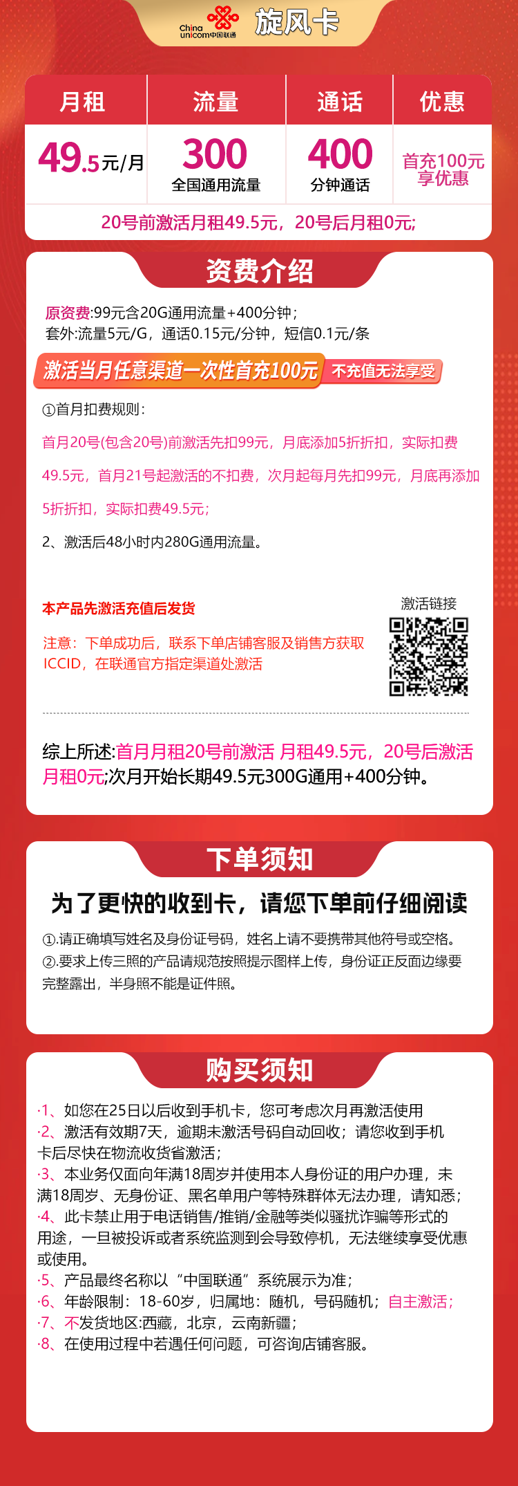 注意:下单成功后,联系下单店铺客服及销售方获取iccid,在联通官方指定渠道处激活