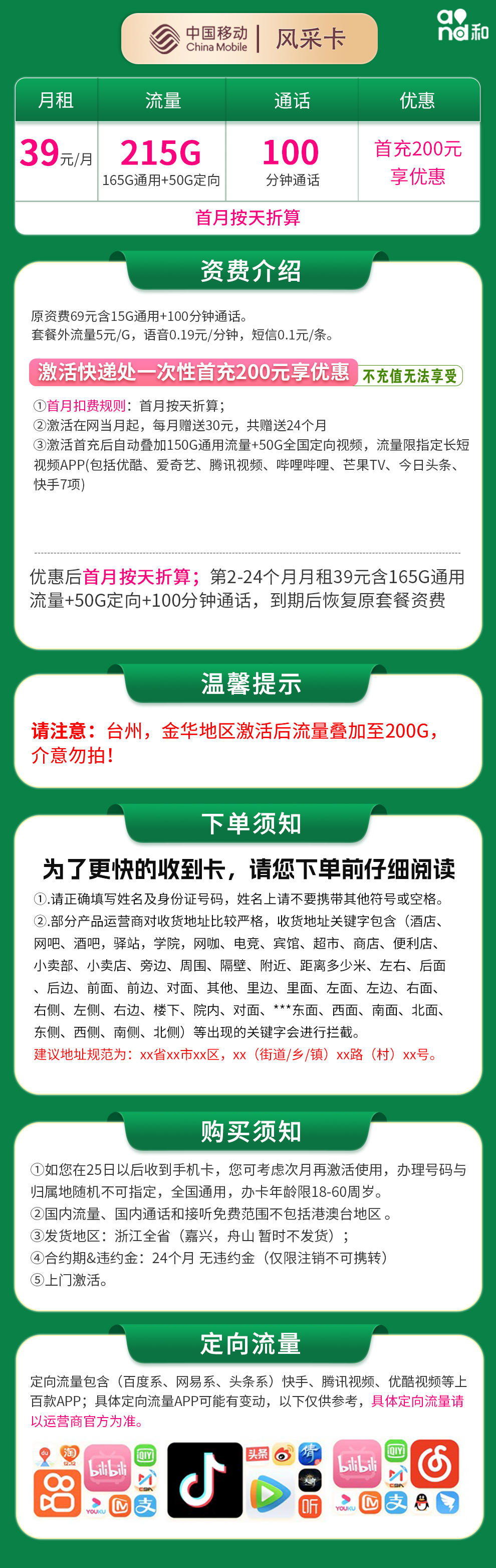- **注意**:台州、金华用户激活后流量为200G(通用+定向合计),其他地区为215G