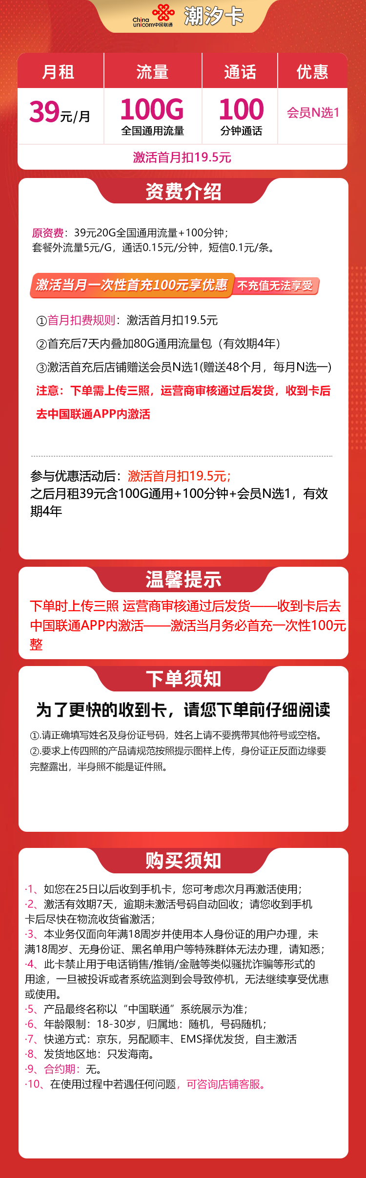 联通潮汐卡39元100G+100分钟【只发海南】
