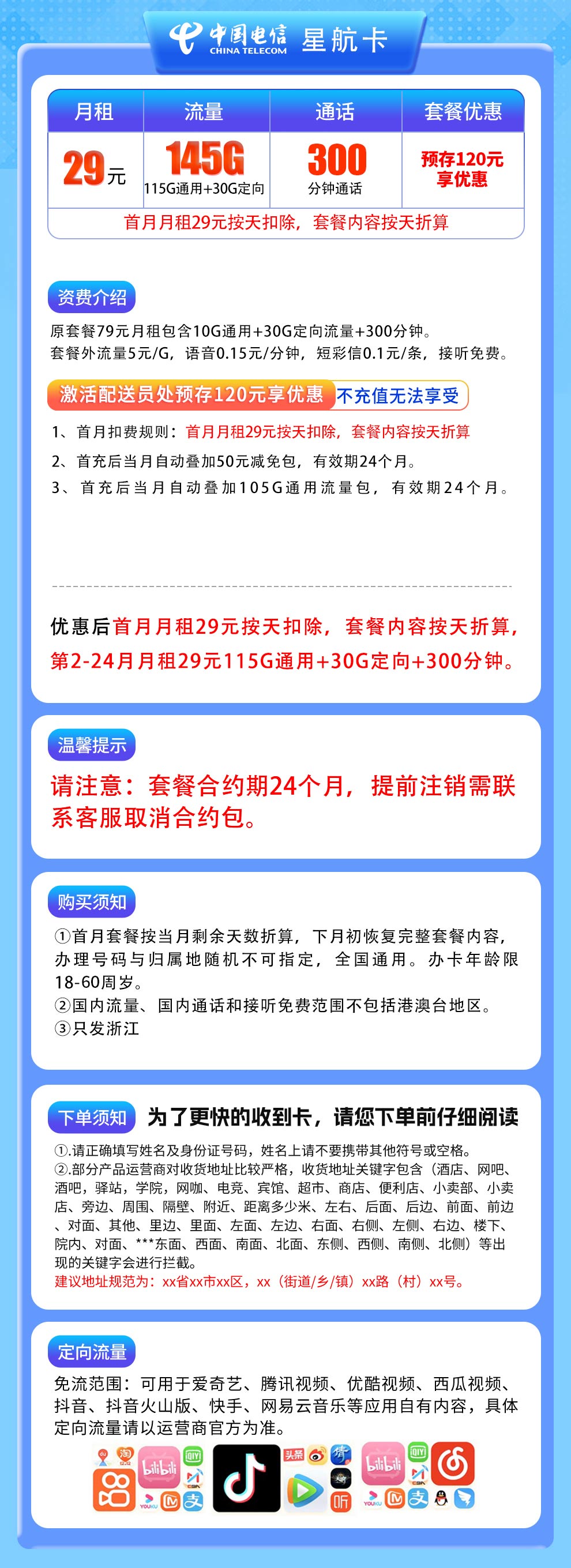 - 第2-24个月:每月29元,含115G通用流量+30G定向流量+300分钟通话。