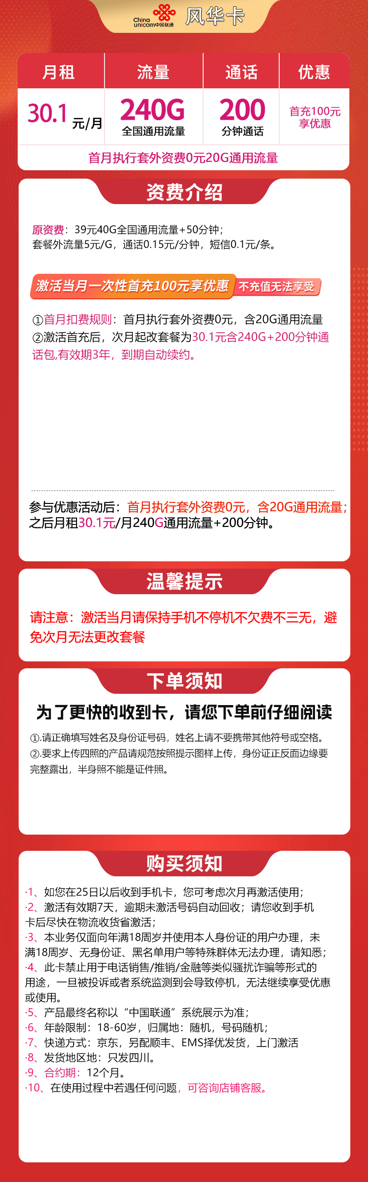 次月开始30.1元240G全国流量+200分钟通话,有效期3年。