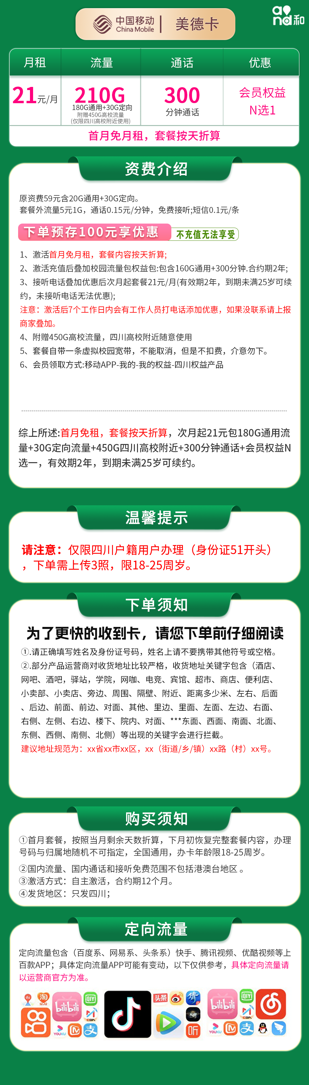 移动美德卡:四川专属,月费21元,含210G流量和300分钟通话。
