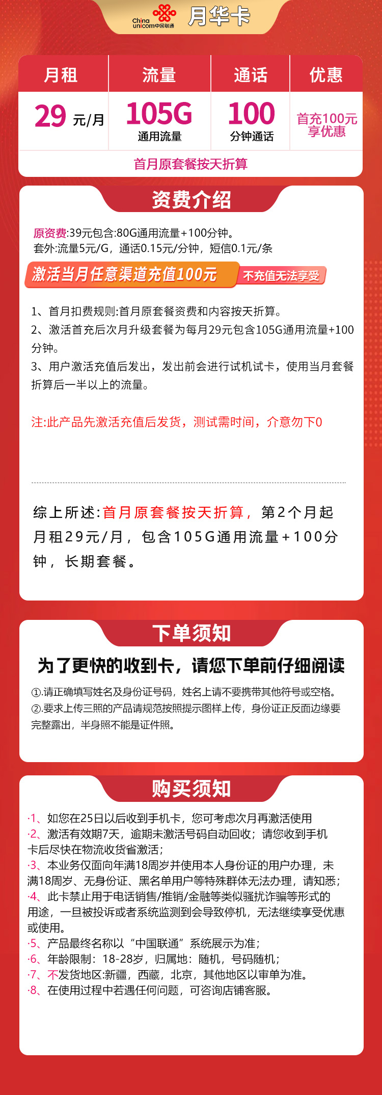 1、首月扣费规则:首月原套餐资费和内容按天折算。2、激活首充后次月升级套餐为每月29元包含105G通用流量+100分钟。3、用户激活充值后发出,发出前会进行试机试卡,使用当月套餐折算后一半以上的流量。注意:此产品先激活充值后发货,测试需时间,介意勿下综上所述:首月原套餐按天折算,第2个月起月租29元/月,包含105G通用流量+100分钟,长期套餐