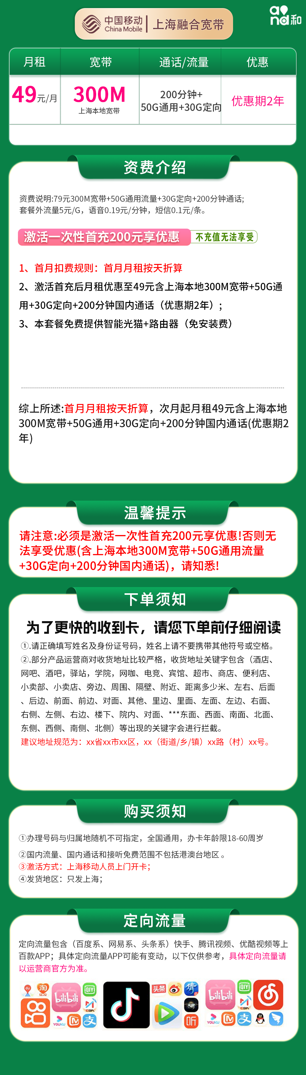 2、激活首充后月租优惠至49元含上海本地300M宽带+50G通用+30G定向+200分钟国内通话(优惠期2年)