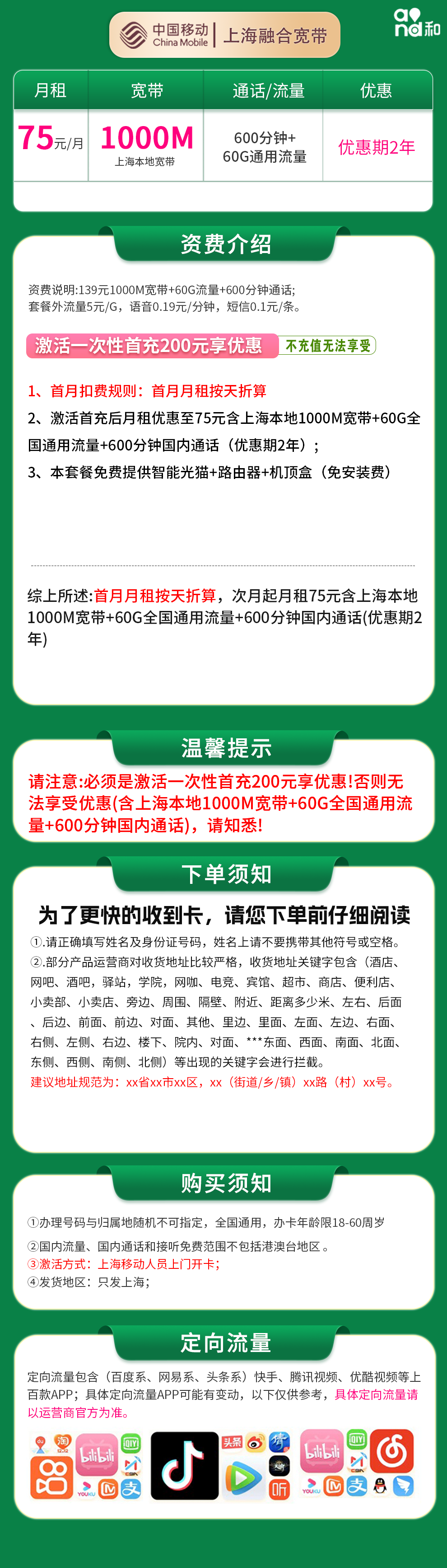 2、激活首充后月租优惠至75元含上海本地1000M宽带+60G通用+600分钟国内通话(优惠期2年)