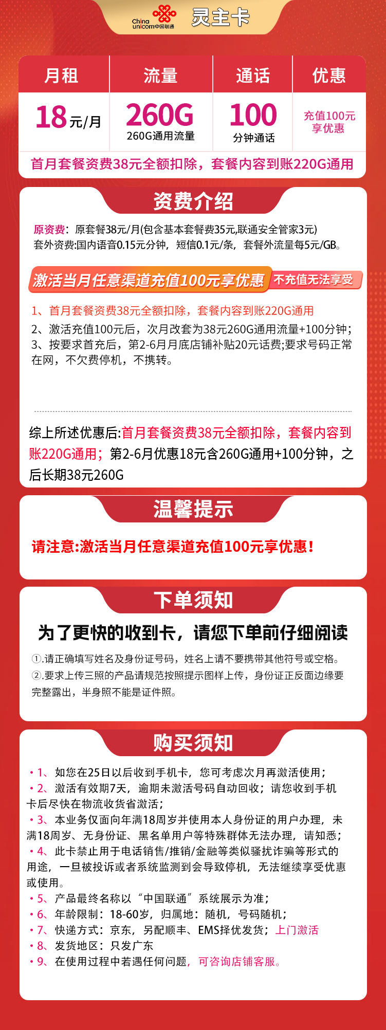 前6个月月租18元,每月260G流量+100分钟通话,之后长期38元。