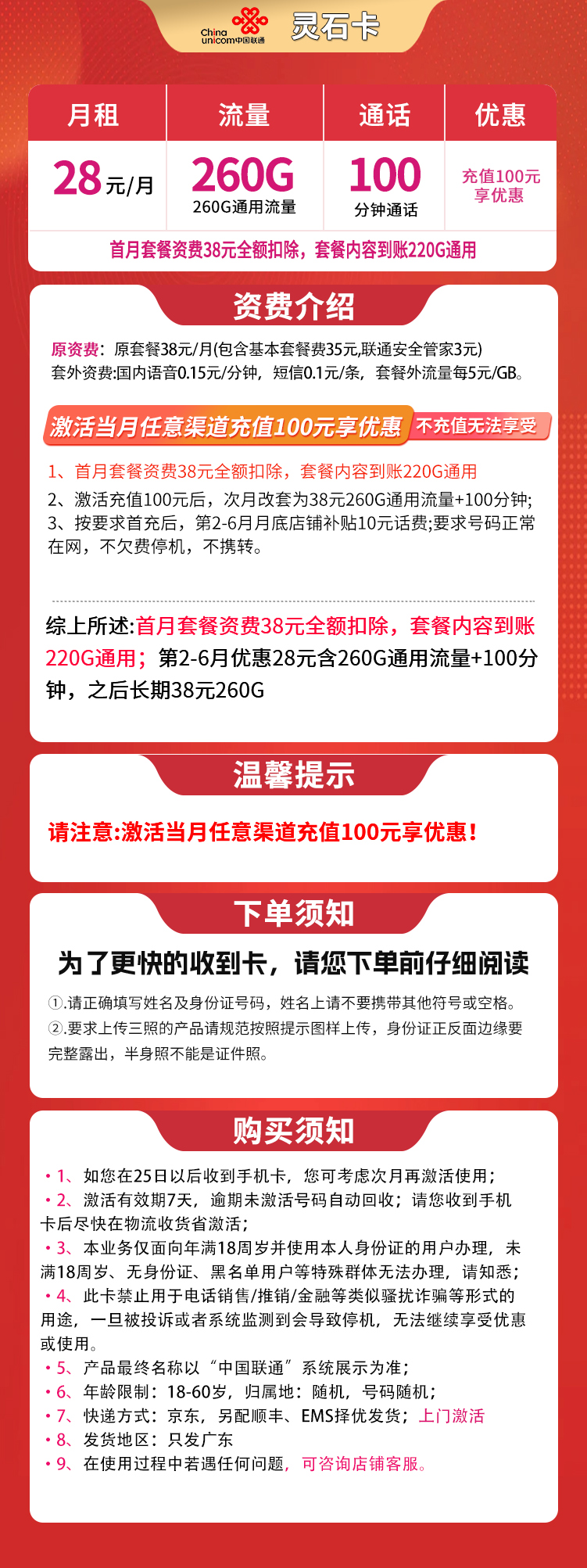 联通灵石卡,仅限广东办理。首月38元得220G通用流量。之后第2-6个月,每月28元享260G通用+100分钟;从第7个月起长期38元享受同样内容。开卡需先充100元,否则无优惠。简单说:首月稍贵,次月起前半年很便宜,之后恢复原价但流量管饱。