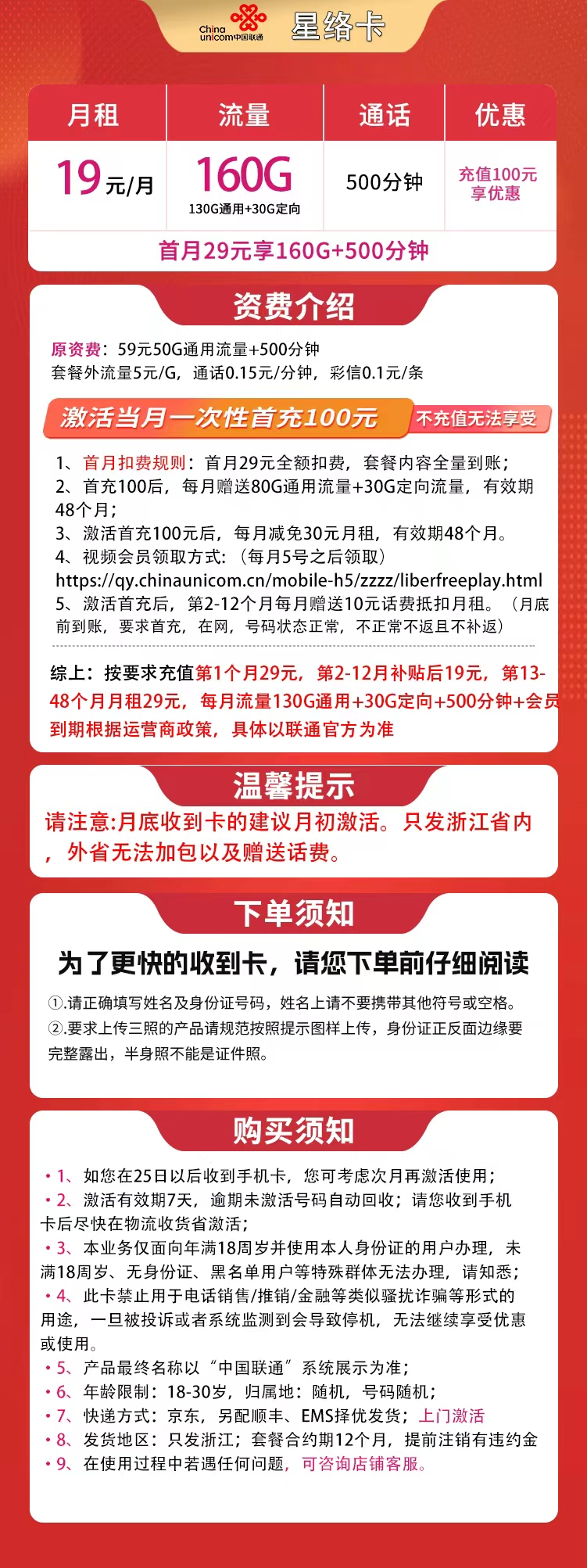 第1个月29元,第2-12月补贴后19元,第13-48个月月租29元,每月流量130G通用+30G定向+500分钟+会员到期根据运营商政策,具体以联通官方为准