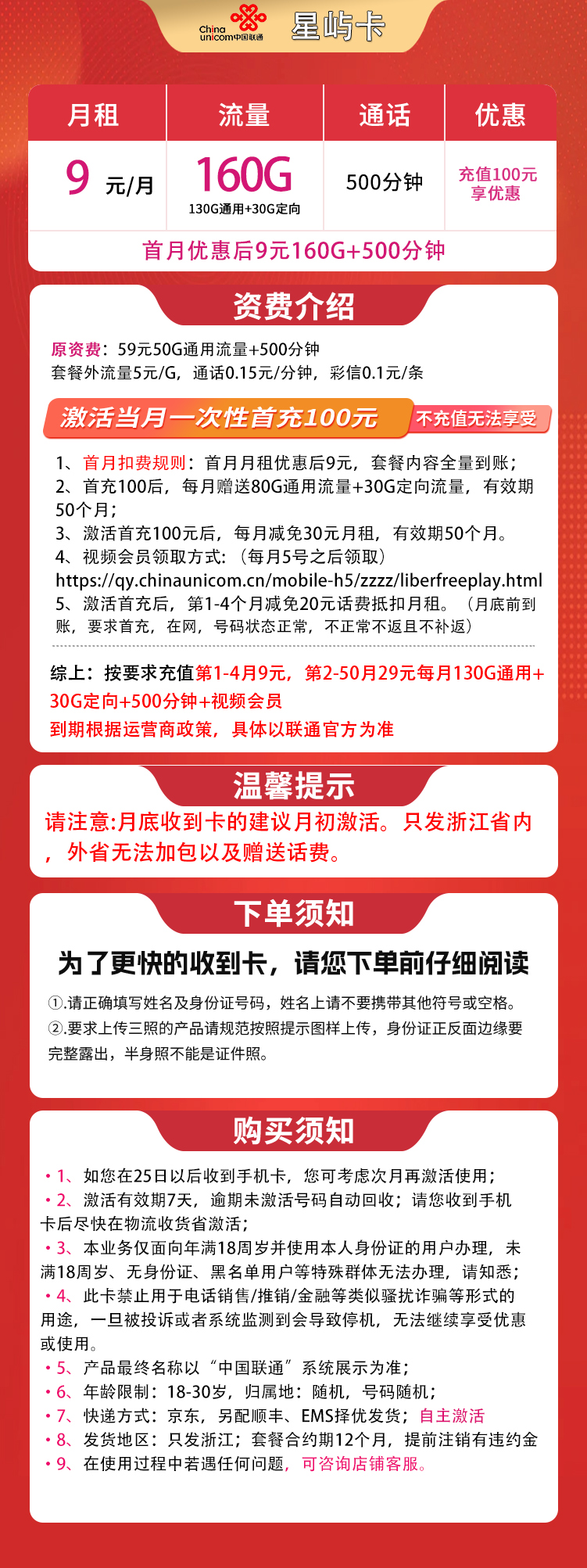 1、首月扣费规则:首月月租优惠后9元,套餐内容全量到账