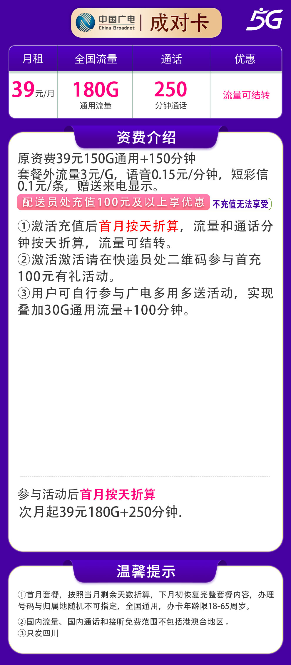 广电四川卡,39元一个月,180G流量加250分钟通话,仅限四川办理。