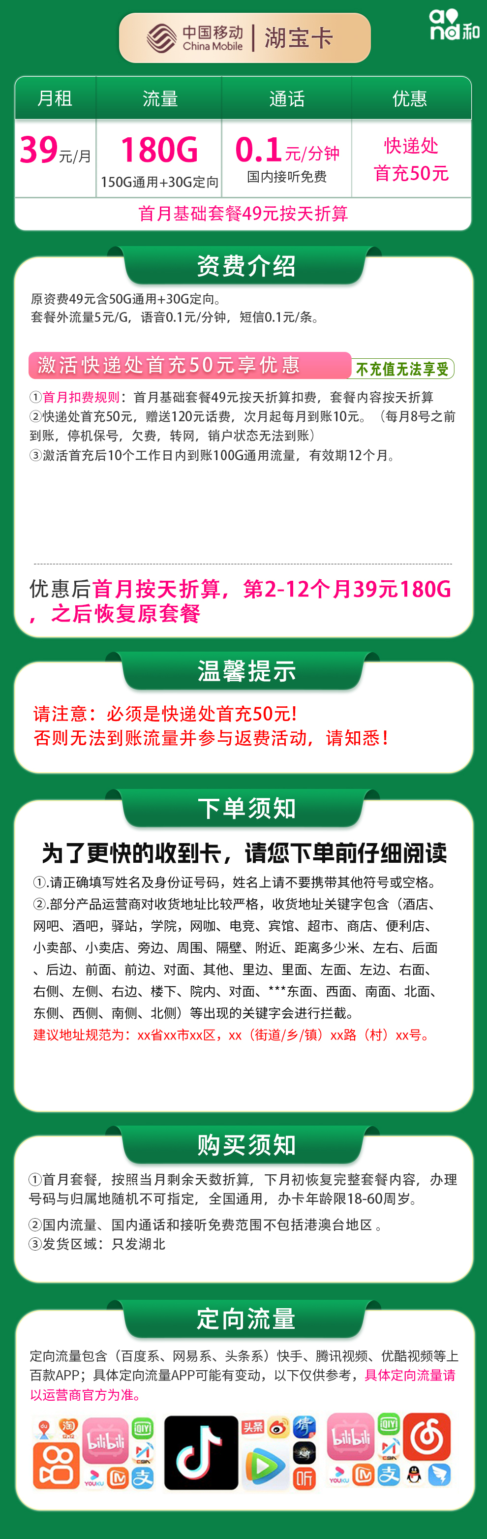 G1移动湖宝卡39元180G【只发湖北】
